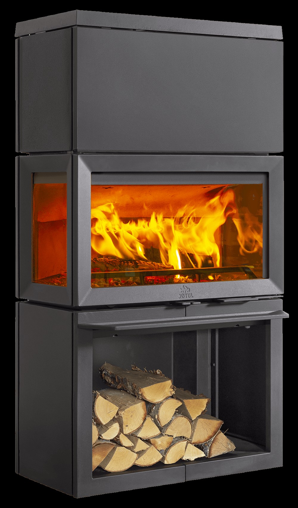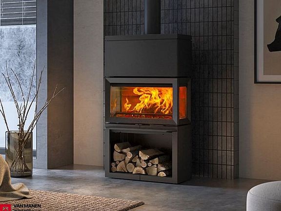 En høy vedovn med gode varmelagrende egenskaper. Vedovnen har plass til varmelagrende steiner i toppen, som kan gi inntil 12 timer ekstra varme etter siste ilegg av ved. Den har i tillegg et praktisk oppbevaringsrom i sokkelen for oppbevaring av ved. Coating på de tre store glassene, og luftspyling, bidrar til renere glass og bedre innsyn til flammene. Sammen med lyse brennplater i solid støpejern vil du få et lyst og luftig flammebilde. Brukervennlige luftventiler gjør den enkel å tenne opp og fyre i, og for sikker fyring har den kubbestopper i brennkammeret og smekklås i døren.