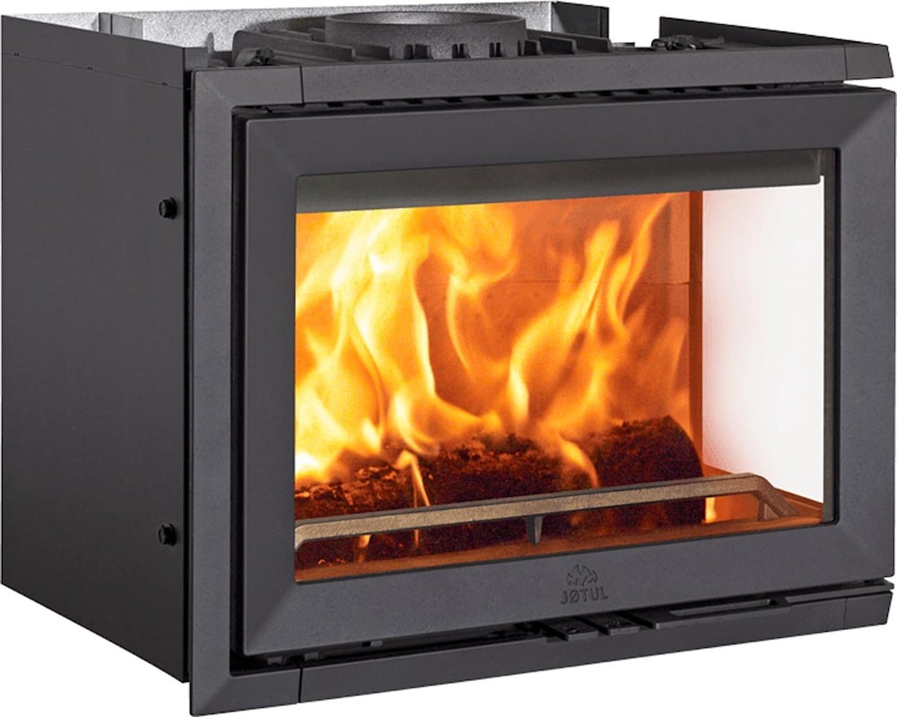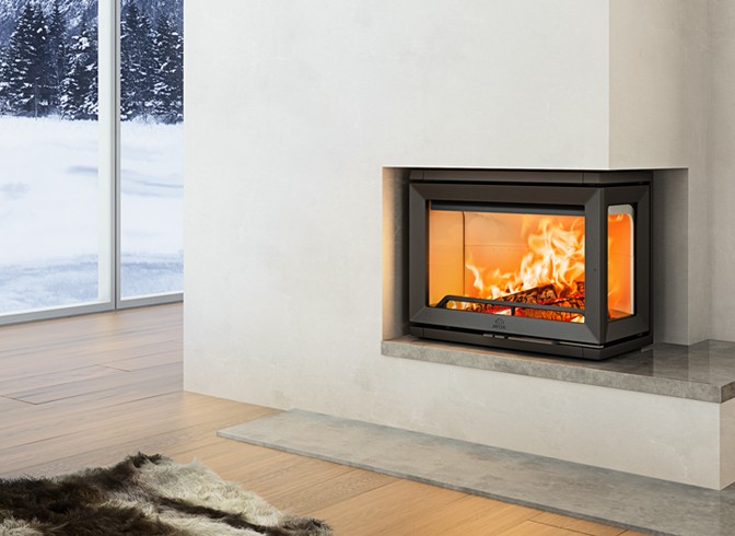 Tidløs peisinnsats med glass i front og høyre side. Peisinnsatsen er produsert i solid støpejern, med lyse emaljerte brennplater på innsiden som gir et luftig innsyn til peisbålet. De store glassene har coating og luftspyling som bidrar til renere glass. Den rentbrennende peisinnsatsen har smekklås i døren, og en kubbestopper i brennkammeret som gjør fyringen enkel og trygg. Som tilleggsutstyr er det mulighet for å endre døren til å bli høyrehengslet. Friskluftstilkobling er tilrettelagt, for optimal oppvarming i lavenergihus